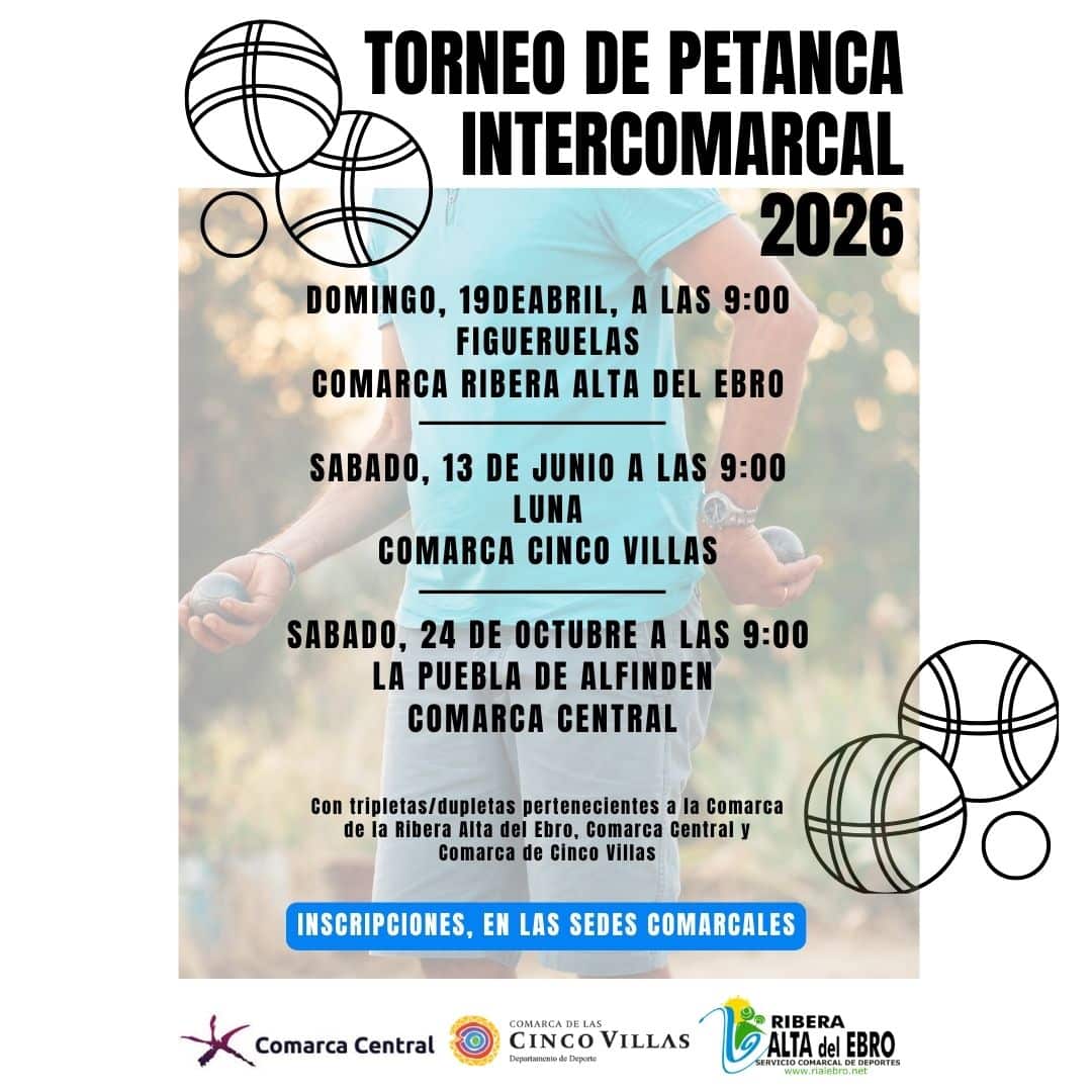 Mañana domingo, 19 de abril, tendrá lugar la primera de las fases del Torneo Intercomarcal de Petanca, en el que participan tripletas y dupletas de la Comarca de Cinco Villas, Ribera Alta del Ebro y Mancomunidad Ribera Izquierda del Ebro.