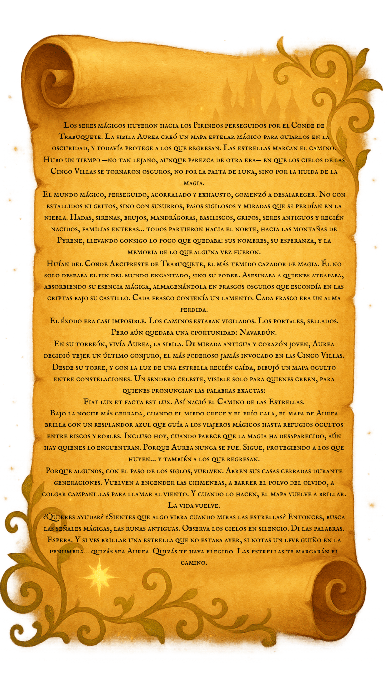 DÉJATE HECHIZAR EN LAS CINCO VILLAS LA MÁGIA ESTÁ OCULTA EN LAS CINCO VILLAS PERO AÚN PUEDESVIVIRLAS EN ESTAS 14 RUTAS EN LAS QUE DESCUBRIRÁS A LOS HABITANTESMÁGICOS DE NUESTRA TIERRA ENCUENTRA LOS PORTALES EN LAS RUTAS ENCONTRARÁS PORTALES. SI LOS DESCUBRES YTIENES SUERTE, LOS SERES MÁGICOS SE MOSTRARÁN. 13 RUTA NAVARDÚN El Camino de las Estrellas MAPA ❖ RUTA ELIGE TU AVENTURA 14 RUTAS MÁGICAS PARA HACER EN FAMILIA A TRAVÉS DE ESTAS 14 RUTAS DESCUBRIRÁS DÓNDE SE ESCONDEN LAS SIRENAS, CÍCLOPES, HADAS, DUENDES Y MUCHOS SERES MÁGICOS QUE HABITAN EN LAS CINCO VILLAS. DESCARGA EL MAPA Consejos para una experiencia segura y agradable Mantén el entorno limpio Respeta la naturaleza No abandones el itinerario señalizado No enciendas fuego Utiliza calzado deportivo cómodo Número de emergencias Ropa adecuada No olvides llevar agua